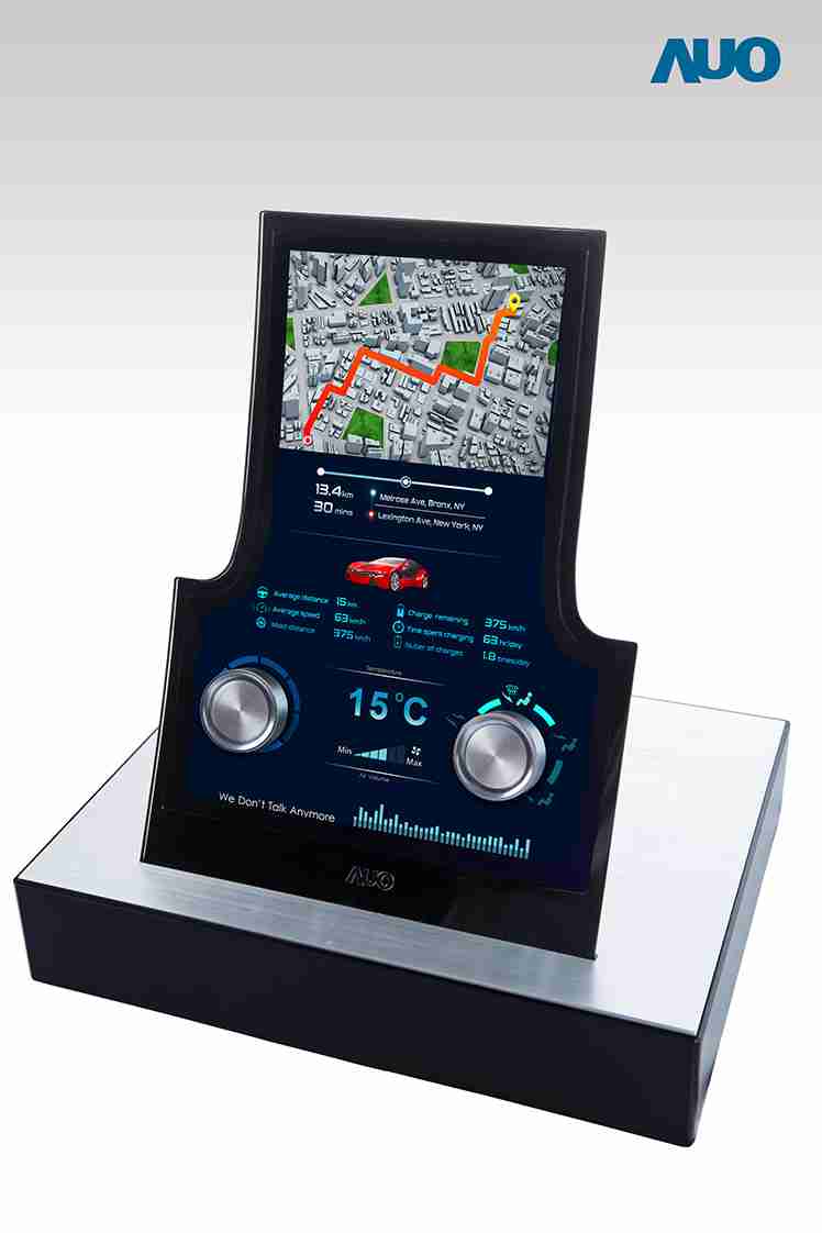 12.3 寸 Full HD LTPS 显示屏同样具备 1000 nits 高亮度,,,,搭载内嵌式触控技术,,,,整合驱动与触控 IC 于显示屏制程,,,使显示屏厚度降低,,为中控台创造更多机构设计空间。。。应用于抬头显示器的 3寸 LTPS 显示屏具有高穿透率、、、1200:1 高对比度度,,以及 297 PPI 高画素密度。。液晶最高可耐受到 110C 的高温 (TNI) 而不液化,,,在阳光高温下维持优异稳定的显示效果。。。