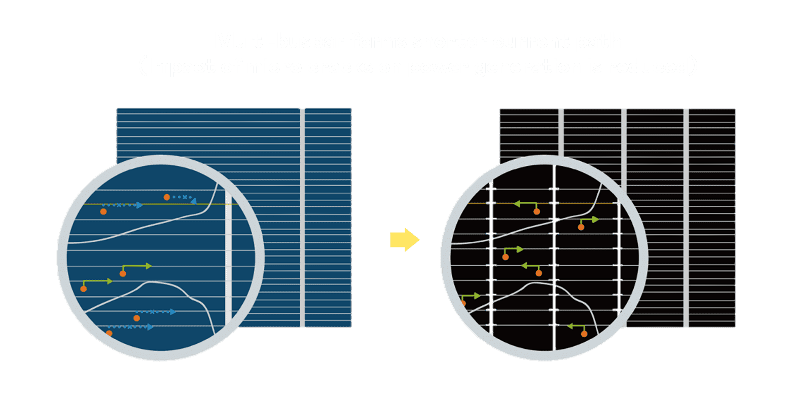 - 电池使用多条铜导线 (Copper wire) 于电池片上形成较短的电流路径,,,,提高电流收集效率,,采用圆形设计的铜导线较传统扁平式的铜焊带 (Ribbon),,,,可增加入射至电池的光线量。。。。