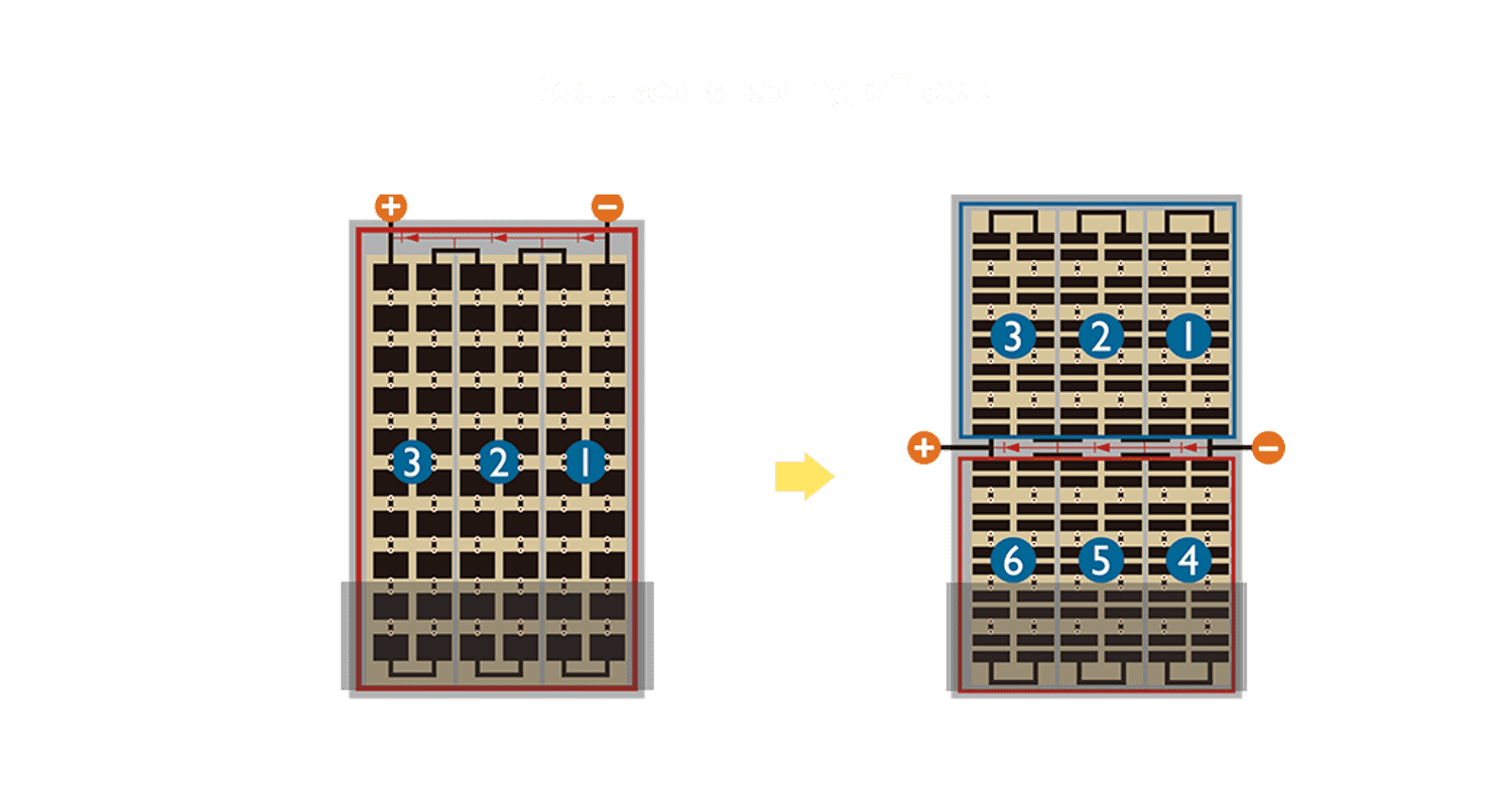 - 结合半切电池,,,,降低遮阴影响、、、、提升模组抗隐裂能力、、、、并减少电阻损耗,,,进一步提升模组发电效能。。。。